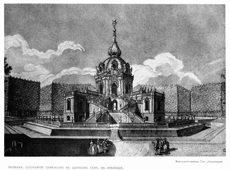 Menagerie (an ensemble of the Alexander Park)In 1750-1752 according to the design of Rastrelli the hunting lands were fenced with the stone fence of 4.5 arshine (about 3.2 metres) instead of the wooden palisade. In the middles of the fence sides there were passages, two fronts crossed the Kuzminka River. So called Menagerie (Zverinets) line of the Upper hothouses, been here from 1722, bordered with the south-eastern front from the outside. According to rules of military engineering the engineer Pyetr Ostrovsky built four bulwarks crowned with lusthauses in the corners of the stone fence. Diagonal clearings which were begun at the Monbijow ground to the lusthauses. The Tsarskoye Selo Menagerie was used for presentations . According to the court ceremonial hunting for the diplomatic corps and other guests of high rank were organized in the Tsarskoye Selo Menagerie. Empress Elisabeth received ambassadors of France and Austria in the pavilion Monbijow that was richly decorated with pictures of hunting plots. . Keeping wild animals in captivity, hunting and high perimeter fence was unacceptable for ideas of landscape parks which became popular and it changed the attitude to menageries. New landscape parks were often begun to create on these areas. The Alexander Park is one of example of this. During the rule of Catherine II, who herself was a lover of hunting, the hunting grounds were located in Tsarskoye Selo environments in forests on the Slavyanka River banks and then in Gatchina Town. Gradually the Menagerie fell into neglect and only in 1799 Emperor Paul I ordered to introduce order in the forest, to repair the Monbijow, the Menagerie roads and clearings, but works were stopped in 1801. In 1803 Alexander I ordered to give a part of the Menagerie area for experiments of The Forestry School organized in Sophia Town. In March 1814 a gardening school or a nursery for trees, that were needed for planting on the vast territory of the creating Alexander Park, was opened. In addition to old clearings landscape roads and paths were paved in the Menagerie during 1819-1823. The east bulwark, surrounded with a ditch, was preserved and included in the new landscape composition of the park. The Menagerie wall and three bulwarks were knocked down, their places were laid out, ditches were filled up. Bricks and stones, remained after dismantling, were used for constructing new buildings: the White Tower, the Chapelle, the Farm group, the Menagerie line of Green Houses, pavilions for llamas and elephants. These pavilions served as the peculiar marking of the borders of the Menagerie territory. Authors