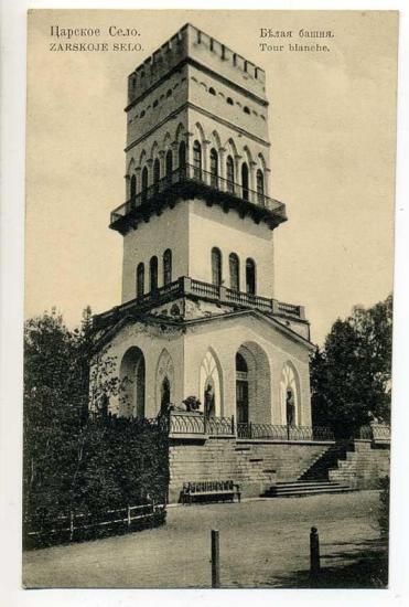 Белая башня (ансамбль Александровского парка)Башня-замок возвышается внутри бастиона на просторной площадке, ранее ее окружали цветники. По высоте квадратное в плане пятиэтажное здание разделено на три яруса, поднимающихся вверх уступами, каждый из них декорировала кованая решетка. На углах террасы, служащей подножием башни, стоят скульптуры львов. В нишах по сторонам башни помещались восемь статуй средневековых рыцарей и древнерусских витязей, отлитых из чугуна. На крышу верхнего яруса, огражденного парапетом, вела внутренняя винтовая лестница. Здесь находилась смотровая площадка, с которой любовались парками, Царским Селом и его окрестностями, был виден даже Санкт-Петербург. Отсюда снимались фотографические виды Царского села для почтовых открыток, получивших широкое распространение в начале XX в. Белая башня, почти полностью разрушенная во время войны, воссоздана по проекту архитектора А. А. Кедринского. Реставрация растянулась почти на два десятилетия и еще не вполне завершена. Вход к Белой башне оформляют Ворота-руины с караулками в готическом характере. Они имеют вид развалин крепостных сооружений, монументальны, имитируют крепостной въезд с подъемной решеткой-герсой. Над аркой помещалась лепная композиция с геральдическим щитом. В стороне перед Воротами-руинами в парке расположен земляной вал, как бы защищающий подход к Белой башне от Фермской дороги. По звездообразному рисунку плана вал напоминает вспомогательное оборонительное сооружение перед крепостью – кронверк. С внешней стороны его окружала канава, соединявшаяся с небольшим прудом. Это остатки земляного укрепления, на постройке которого наглядно обучались фортификации августейшие сыновья императора Николая Павловича. Впоследствии внутри «звезды» была поставлена высокая мачта с веревочными лестницами; вокруг нее натягивалась сетка для прыгания. Летом, когда парк открывали для публики, здесь собиралось множество детворы. Г. В. Семенова Авторы