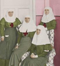 Empress and Grand Duchesses dressed in the uniforms of nurses.
