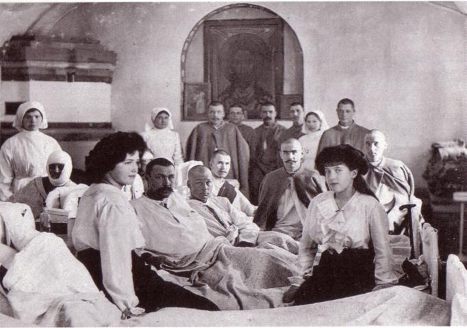 19143 February. In the Alexander Palace, Nicholas II received Maurice Paleologue, the new French ambassador, and all members of the French Embassy. 24 June. The laying of the new barracks of the 2nd Infantry Regiment, the 3rd Infantry Regiment and the Escort Unit took place in the presence of Nicholas II. 20 July. The Manifesto declaring the war against Germany was signed . August. Princess V.I. Hedroitz re-equipped the Tsarskoye Selo palace hospital for the surgery of wounded men and she taught the Empress, Grand Duchess Olga and Grand Duchess Tatyana to work as nurses, then they regularly nursed in a hospital from 1914 until the summer of 1917. 5 August. А. Akhmatova , N.Gumilev (he was dressed in military uniform) and A. Blok had dinner at the Tsarskoye Selo Station in Petersburg. 28 August. The hospital "Their Majesties Grand Duchesses Maria Nikolayevna and Anastasia Nikolayevna was opened at the Fiodorovsky Cathedral" . During 1914 only in Tsarskoye Selo more than 50 hospitals were opened, including the hospitals in private houses. 1 September. The information about the defeat of Austria troops in Galitsia and along the front was received in Tsarskoye Selo. 6 November. Empress Alexandra Fiodorovna with her daughters Olga and Tatyana, together with 42 nurses of the 1st military graduates, succefully passed the examination and received nurse certificates in the building of the Red Cross Society in Leontyevskaya Street. Architect V.А. Pokrovsky constructed barracks of the 3rd Life-Guard Infantry Regiment, in Kadetsky Boulevard, designed in the spirit of the old defence constructions of Russian towns. November. Artist О.L.Della -Vos- Kardovskaya finished the portrait of А.Akhmatova and drew the statue of " Rome Matrona" of the Catherine Park into the album of the poet; А.Akhmatova, in her poem "In Tsarskoye Selo", named this statue as "her marble twin" The end of November. Funerals of warriors, who perished in battles of WWI or died from injuries later in the hospitals of Tsarskoye Selo, were began on the plot near the Kazansky cemetery, on the initiative of Empress Alexandra Fiodorovna. More than 1,000 warriors were buried here from 1914 until 1917. Persons