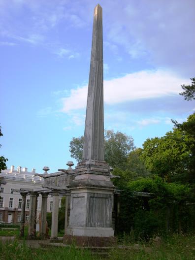 The Kagul Obelisk, a monumentThe architect: Antonio Rinaldi (1709-1794) The obelisk was erected in 1771-1772 Materials: the obelisk and pedestal are made of Siberian grey with veins marble; steps are made of Tivdia red marble; the plinth and stylobata are made of pink granite; the plague with inscription is made of bronze. Inscriptions: On the plague from the northern side of the pedestal: In memory of the victory at the Kagul River in Moldavia on 21 July 1770, under the heading of General Count Pyetr Rumyantsev the Russian army 17 thousands in number put the 150-thousand army of Vizier Galil-bey to flight up to the Danube River. The modest needle-shaped obelisk without allegory decorations and attributes influences upon viewers by the sophistication of its silhouette, the scale and colour spectrum of used marbles. The obelisk is included into the series of the Tsarskoye Selo monuments devoted to the Russo-Turkish War of 1768-1774, from which the theme of military glory in the native monumental art has started. The late 1770s - the 1790s. The further improvements of the New (Alexander) Garden. The construction of the Chinese Village, Small and Great Caprices. Persons