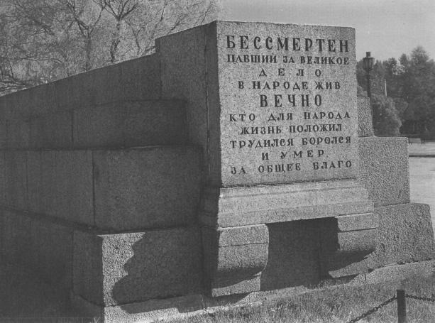 Борцам революции, памятникРубрикатор / Памятники Санкт-Петербурга/1917 – 1991 Архитектор: Руднев Лев Владимирович (1885-1956) Художники: Конашевич Владимир Михайлович (1888-1963) Тырса Николай Андреевич (1887-1942) Автор текстов: Луначарский Анатолий Васильевич (1875-1933) Открыт 7 ноября 1919 г. Материалы: гранит розовый, серый, кованый. Надписи: на торцевых сторонах памятника врезными тонированными знаками: К сонму великих / ушедших от жизни / во имя жизни расцвета / героев восстаний / разных времен к толпам якобинцев / борцов 48 / к толпам коммунаров / ныне примкнули / сыны Петербурга; Не жертвы – герои / лежат под этой могилой / не горе а зависть / рождает судьба ваша / в сердцах / всех благородных / потомков / в красные страшные дни /славно вы жили и умирали прекрасно; По воле тиранов /друг друга терзали / народы / Ты встал трудовой / Петербург / и первый начал войну / всех угнетенных / против всех угнетателей / чтоб тем убить самое семя войны; Против богатства / власти и знанья /для гордости / вы войну повели / и с честию пали / за то чтоб богатство / власть и познанье / стали бы / жребием общим; 1917–1918 / вписали в анналы / России / великую славу / скорбные светлые годы / посев ваш / жатвой созреет /для всех населяющих / землю; Не зная имен / всех героев борьбы / за свободу / кто кровь свою отдал / род человеческий / чтит безименных / всем им в память / и честь / этот камень / на долгие годы / поставлен; Бессмертен / павший за великое /дело / в народе жив / вечно кто для народа / жизнь положил / трудился боролся и умер / за общее благо; Со дна угнетенья / нужды и невежества / поднялся / ты пролетарий / себе добывая / свободу и счастье / все человечество / ты осчастливишь / и вырвешь / из рабства на надгробных плитах врезными тонированными знаками: Здесь погребены погибшие в дни / Февральской революции / и деятели Великой Октябрьской / социалистической революции / павшие в боях в годы Гражданской войны; В.Володарский/ 1891–1918 / убит правыми эсерами/ Семен Петрович/ Восков / 1888–1920 умер на фронте; Юному /артисту-агитатору / Коте / Мгеброву-Чекан / 1913–1922; Раков А.С. Таврин П.П. /Купше А.И. Пекар В.А. /Дорофеев Калинин / Сергеев / погибли в бою с белогвардейцами / 29 – V – 1919; Владимир Осипович / Лихтенштадт-Мазин / 1882–1919 погиб в бою / Виктор Николаевич / Гагрин / 1897 – 1919 умер на фронте / Никандр Семенович / Григорьев / 1890 – 1919 убит в бою; И.А.Рахья 1887–1929 / Ф.Кеттунен 1889 – 1920 / Ю.В.Сайнио 1880–1920/ Е.Саволайнен 1897–1920 / В.Е.Иокинен 1879–1920 / К.Линквист 1880–1920/ Ю.Т.Вийтасаари 1891–1920/ Т.В.Хюрскюмурто 1881–1920/ убиты финнами-белогвардейцами / 31 VIII 1920; Рудольф / Федорович / Сиверс / 1892–1918 умер после боя от ран / Николай / Гурьевич / Толмачев / 1895–1919 погиб в бою с белогвардейцами; Семен Михайлович / Нахимсон / 1885–1918 / расстрелян белогвардейцами в Ярославле /Петр Андрианович / Солодухин / погиб в бою 1920 г; Моисей / Соломонович / Урицкий / 1873–1918 убит правыми эсерами / Григорий / Владимирович / Цыперович / 1871–1932; Красные латышские стрелки / Индрикис Дайбус, Юлий Зостынь / Карл Лиепинь, Эмиль Петерсон, / павшие при подавлении / белогвардейского мятежа в Ярославле / в июле 1918 года; Лев Михайлович / Михайлов-Политкус / 1872–1928 / Михаил Михайлович / Лашевич / 1884–1928/ Иван Ефимович / Котляков / 1885 –1929; Константин Степанович / Еремеев / 1874–1931 / Иван Иванович / Газа / 1894–1933 /Дмитрий Николаевич /Авров / 1890–1922 В дни Февральской революции 23—27 февраля 1917 г. в уличных боях Петрогра