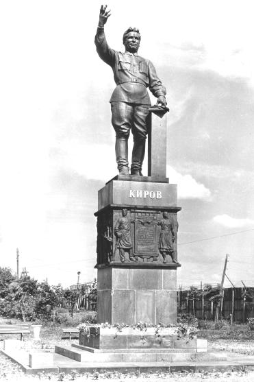 Кирову С.М., памятник (Московское шоссе, 13)Рубрикатор / Памятники Санкт-Петербурга/1917 – 1991 Скульптор: Томский Николай Васильевич (1900-1984) Открыт 21 марта 1937 г. Материалы: бронза – скульптура, горельефы, текстовая доска, литеры; гранит полированный – постамент. Надписи: на постаменте с лицевой стороны накладными литерами: Киров; текст доски литыми знаками: Успехи, / действительно, / у нас громадны. / Чорт его знает, / если по челове / чески сказать, / так хочется – / жить и жить. Памятник установлен на территории мясокомбината, первенца мясной индустрии советских пятилеток, строительством которого руководил С. М. Киров. Скульптура и барельефы, отражающие производственную жизнь комбината, отлиты на заводе «Монументскульптура». На доске помещена цитата из выступления Кирова на XVII съезде ВКП(б). Высота скульптуры — 3,8 м, высота постамента — 4,2 м. Персоны