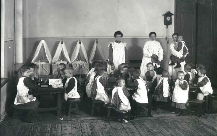«ЯСЛИ» Санкт-Петербургское обществоПод опекой общества оказывались дети в возрасте от 4 недель до 7 лет. Ежегодный взнос для действительных членов общества составлял 5 рублей (или 100 рублей единовременно), для членов-сотрудников – 1 рубль; лица, внесшие в кассу общества единовременно не менее 500 рублей, могли быть избраны его почетными членами. При открытии общества в нем числилось около 70 членов, к концу первого года – 220. В первый состав Правления вошли кнж. Мария Сергеевна Щербатова (председательница), Ю. П. Муханова (товарищ председательницы; позже ее сменила С. П. Дурново), Н. С. Танеева (казначей), И. О. Фесенко (секретарь), М. С. Волкова, С. В. Трахимовская, А. А. Охтина, А. Ф. Остроградский. Касса общества пополнялась за счет членских взносов, частных пожертвований, кружечного сбора, доходов от благотворительных спектаклей и базаров. Пожертвования в пользу общества вещами изначально сделали вел. кнг. Елизавета Маврикиевна и принцесса Евгения Ольденбургская; самое большое денежное пожертвование (700 рублей) поступило от прот. И. И. Сергиева (о. Иоанна Кронштадтского), ставшего почетным членом общества. Приход к концу 1893 составил 10 800 рублей. 17 марта 1893 общество открыло 1-е дневное убежище для детей работниц в бедной рабочей местности Пески – на 8-й Рождественской ул. (ныне 8-я Советская ул.), в четырех комнатах в доме Шпигеля. Надзор за убежищем осуществляла М. А. Любимова, медицинское наблюдение – врач А. Н. Шибанова, занятия с детьми по системе Фрейбеля – А. А. Виташевская. Число посещений заведения ежемесячно доходило до 940 (за весь 1893 г. – 5 800); наряду с этим в месяц отпускалось до 460 обедов на дом, опекаемые дети снабжались одеждой и обувью. Позже 1-е убежище переехало на 3-ю Рождественскую ул., 28, и при нем был организован ночлежный приют, где постоянно проживало 16 детей, временно – 6. В 1910-е в приюте содержалось 20 девочек и девушек в возрасте до 17 лет; здесь их готовили к работе нянями в других заведениях. В том же здании находились доходные квартиры общества, приносившие чистый доход от 960 рублей (1903) до 2 050 рублей (1915) в год.К началу 1900-х на попечении общества находились следующие заведения: 1-е дневное убежище с приютом; 2-е убежище с ночлежным приютом на 10 постоянных и 4 временных мест (Нарвский пр., 3; попечительница – Е. Г. Опочинина, позже – гр. Е. А. Толстая; содержательница ночлежного приюта – гр. Е. А. Мордвинова; в 1910-е в приюте проживало 10 мальчиков в возрасте до 9 лет); 3-е убежище (Б. Охта, Георгиевская, ныне Шепетовская ул., 35; попечительница – кнж. М. С. Щербатова, ее помощницы – А. Н. Элиаш и М. Н. Обольянинова; в 1910-е попечительница – Л. Д. Кобеляцкая); 4-е убежище (В. О., Большой пр., 87 / Княгининская, ныне Детская ул., 5; попечительница – М. П. Кривошеина, ее помощница – В. Е. Чистякова, позже попечительница – М. А. Пыхачева; при убежище была организована детская щеточная мастерская; в 1903 устроен временный ночлежный приют для пострадавших от наводнения 12 ноября); 5-е убежище с ночлежным приютом и молочной фермой (Охтенские пороховые заводы, Колтушское шоссе, собственный дом; при убежище действовала мастерская детских работ; попечительницы – М. А. Жеребятьева-Красильникова и Л. А. фон-Крузе, в 1910-е – С. И. Султан-Шах); 6-е убежище (Малый пр., 14; попечительница – М. К. Карпантье, ее помощницы – Е. В. Фриш и Е. Г. Растеряева; в 1910-е попечительница – Е. Г. Болин); 7-е убежище при Бо