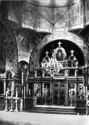 Трехъярусные золоченые иконостасы вырезали на петербургской фабрике Шредера; образа написали акад. П. Ф. Плешанов и К. А. Горбунов. Орнаментальную роспись по эскизу Плешанова исполнил Н. В. Розанов. Запрестольным образом в храме было известное „Моление о чаше“ Ф. А. Бруни в копии того же Плешанова. Храм был полон света: днем его освещали многочисленные окна, в сумерки – красивые канделябры и люстра из бронзы, сделанные на фабрике Шопена.