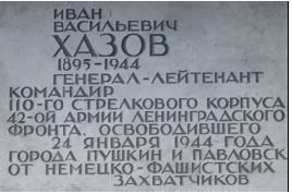 Мемориальная доска И. В. ХазовуКомандир 110-го стрелкового корпуса 42-й армии Ленинградского фронта. Участник освобождения от блокады города Ленинграда. Генерал-лейтенант И. В. Хазов погиб в боях за реку Великую. |